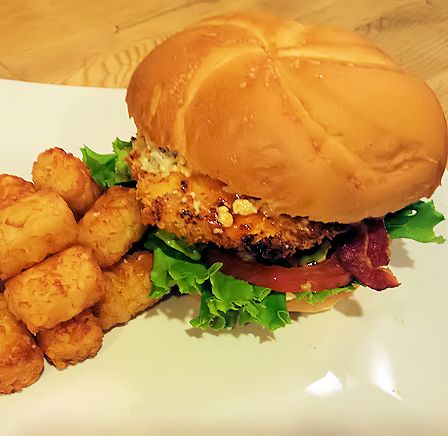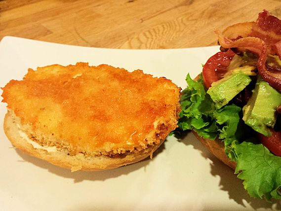 To say that this was good would be an understatement. Not that I usually try and make things taste like fast food but come on we all know the sense of contentment when that one burger from your favorite fast food place hits the spot and a smile crosses your face. Then we look around to make sure no one saw that. Well this is that sandwich! Melty blue cheese, bacon, warm kicked up Texas Pete sauce and crispy baked Panko breaded chicken..oh did i say bacon? Ok let do this…..