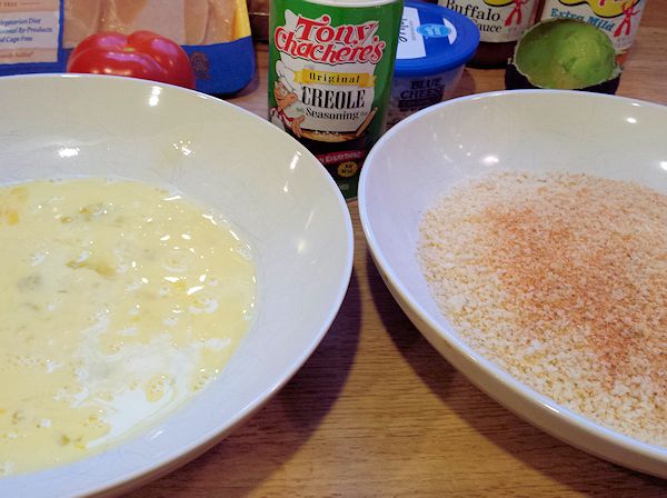 Next set up your breading station. Put two eggs in a bowl and beat with a fork add about 2 Tbs of water and beat in the eggs just to thin it out some. When you make scrambled eggs, the omelet will be fluffier and you wont have that runny egg consistency after they are cooked if you use water instead of milk. Try it, it was a great tip from a good chef 🙂 In another bowl, put the two cups of Panko bread crumbs and add in 1 to 2 tsps of Creole/ Cajun or soul food seasoning.