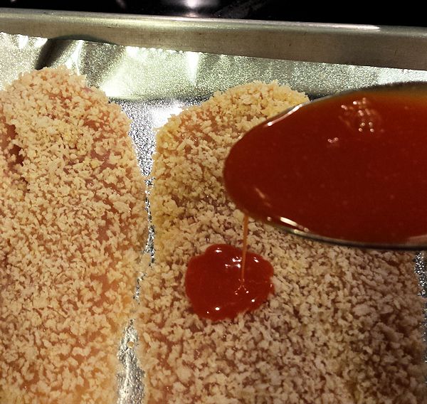Place chicken into oven and let it get golden brown. The Panko will stay nice and crispy, which I love. Since these are thin breasts they will take only about 20 minutes. Test for doneness. Your chicken should be at 165 degrees. If for some reason you can not find the thin sliced, you can always get the regular and fillet it yourself by cutting in half on the horizontal.