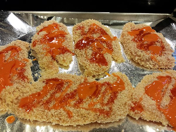 Set coated chicken onto sprayed baking pan when each piece has been coated.