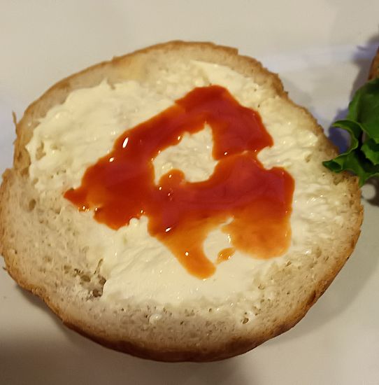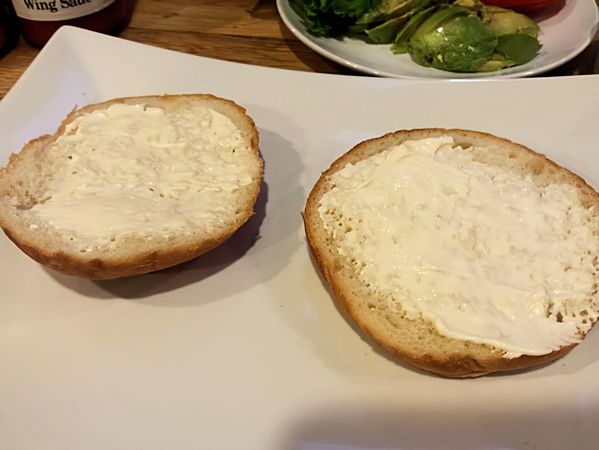 While the chicken is cooking, prepare the plate. Buns, add mayo to each side only about 1 Tb each should do it. Mayo or Vegganaise you choose your way.
