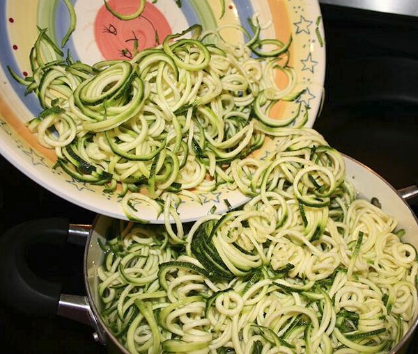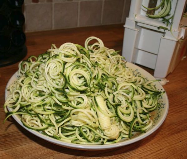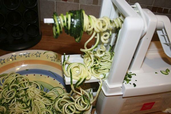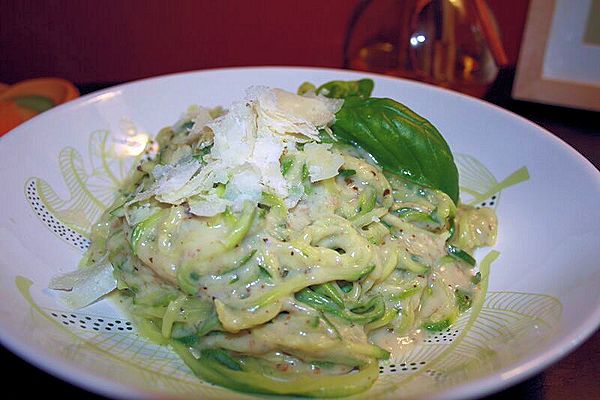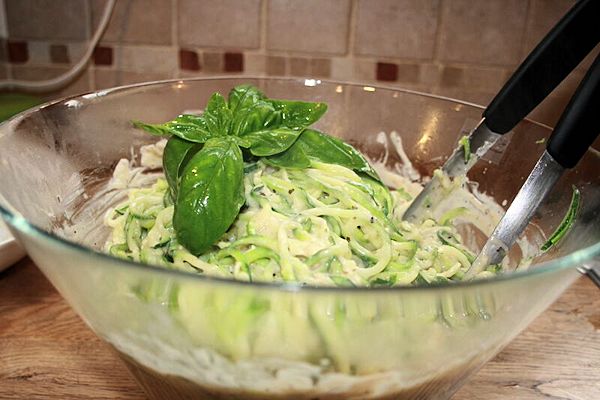 Oh my, how I love Alfredo but apparently noodles – well carbs in general – no longer like me 🙂 . I have been trying all kinds of things lately. Rice noodles, brown rice noodles, tofu noodles and even mung bean noodles… yes, even those. Well, I had heard about this spiralizer from Paderno. I actually saw it used by one of my favorite soap stars(What? I am female and I watch a soap. Moving on…) It was amazing. I love veggies!! The idea of making my favorite veggies into spirals intrigued me. So off I went to purchase my new kitchen item! I must say I have enjoyed it very much. These zucchini noodles are every bit as delicious as the real thing. My daughter now asks for these instead of her favorite dish, which is meatball and spaghetti. Now let me say I have used these in so many ways already before posting this dish, I have used regular pasta sauce, carbonara sauce which I loved, pesto zucchini and an olive oil and garlic sauce which was yummy as well. Hands down though, this version is a winner for everyone.