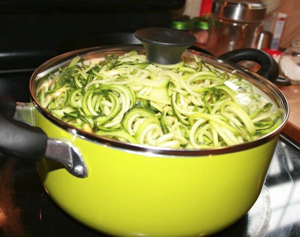 In a large pot , fill with water about 3/4 full and add your zucchini into pot. Add a few pinches of salt just like you would pasta.
