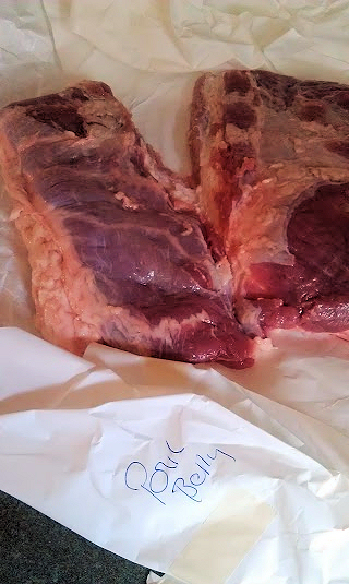 So if you have trouble finding pork belly, you might want to try your local butcher. If that fails, look for an inner city market. I happened to find mine in Cincinnati at Findlay Market. Foodness, I mean goodness! If you ever get the chance, please go. It’s like being in New York at all the best delis and butchers in one place. I loved it! If I could have, I think I would of spent the day there just trying bits and pieces of things here and there, but I had a mission: pork belly. I bought 4 pounds and asked them to slice it for me. I learned this the hard way after doing this chore myself and almost killing my fingers and back as long as it took me. I realized I am not butcher. See below: