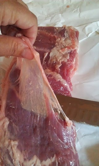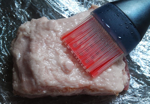 Turn over and wipe the skin clean then dry the pork skin with a damp paper towel. Brush it with the cure of the vinegar and salt.