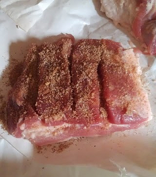 Rub the pork bellies with the dry rub on the meaty side. Save the left over dry rub.