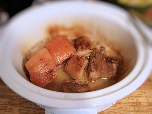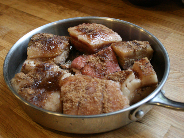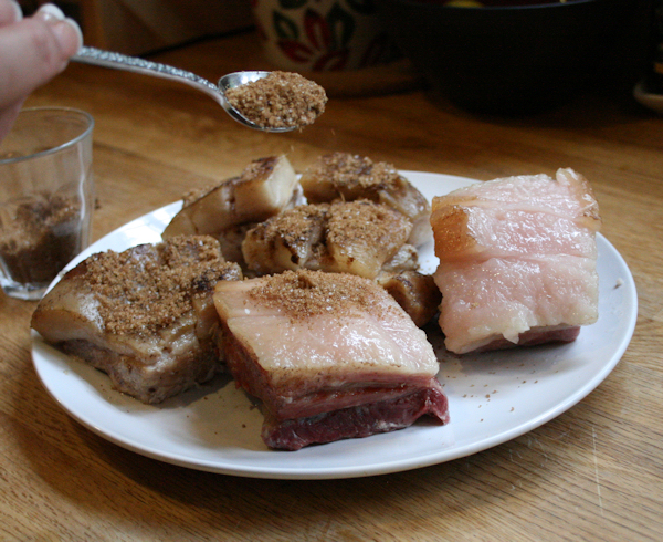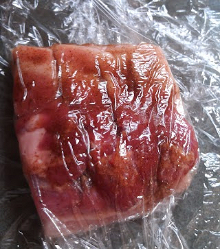 When I came home, I had nice tender pork belly. I transferred this now tender pork onto a plate and brushed and rubbed rubbed with the five spice blend mixture, top and bottom.
