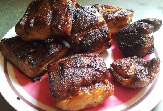 I had followed many a recipe on pork bellies, never getting any of them quite right until now. I found a way to make these little devils tender and then finish them off into a crispy wonderful bite. If you have not tried pork belly before, I encourage you to try it in a restaurant atmosphere first. The love you will feel for this is beyond explanation and you, like me, will then go home and want to recreate this mouth watering perfect thing that hit your mouth. Finally on my third attempt, I think I have it! Soft yet tasty and oh so crispy said the third little piggy. So this is my attempt at doing just that. My spin is a little bit Asian and a little bit pit master with Betty Crocker thrown in. In the end it was something that I had none left of when the night was over.