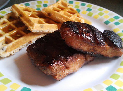 It’s really that easy and oh so tender. It’s like eating pork with crispy bacon on top and just melts in your mouth. You can serve this with mashed sweet potatoes, or creamy polenta. Tonight I went with waffles it was daughters choice and let’s face it she can eat bacon with anything!