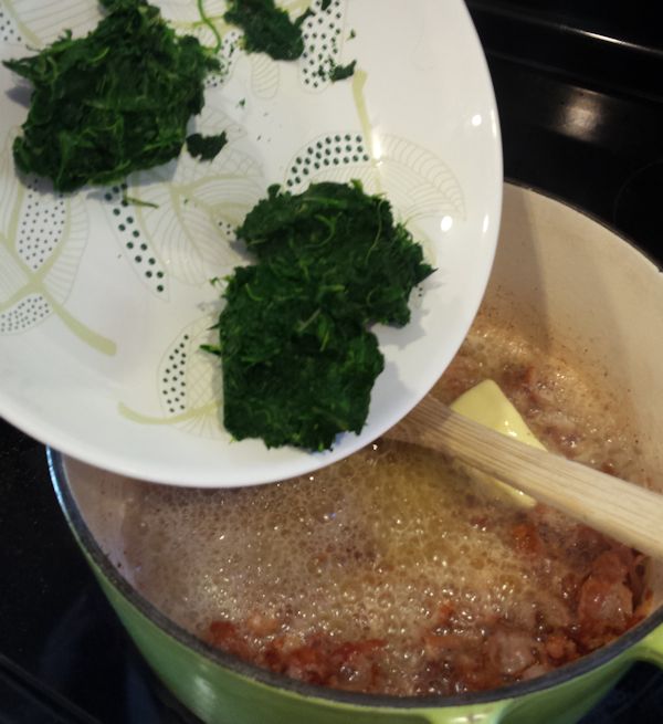 Pancetta, Spinach and White Wine Garlic Alfredo over Spaghetti Squash
