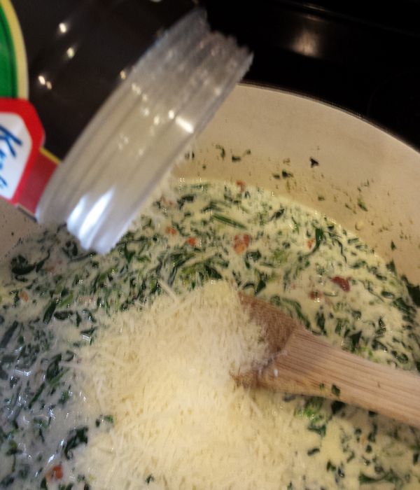 Pancetta, Spinach and White Wine Garlic Alfredo over Spaghetti Squash