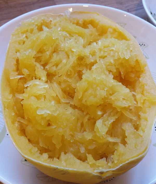 Pancetta, Spinach and White Wine Garlic Alfredo over Spaghetti Squash