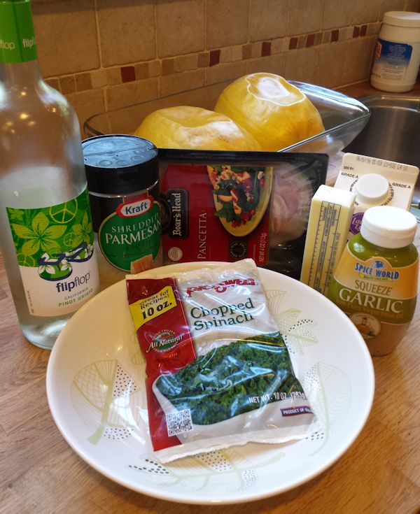 Pancetta, Spinach and White Wine Garlic Alfredo over Spaghetti Squash