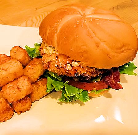 bcsfinal1To say that this was good would be an understatement.   Not that I usually try and make things taste like fast food but come on we all know the sense of contentment when that one burger from your favorite fast food place hits the spot and a smile crosses your face. Then we look around to make sure no one saw that. Well this is that sandwich! Melty blue cheese, bacon, warm kicked up Texas Pete sauce and crispy baked Panko breaded chicken..oh did i say bacon?  Ok let do this…..
