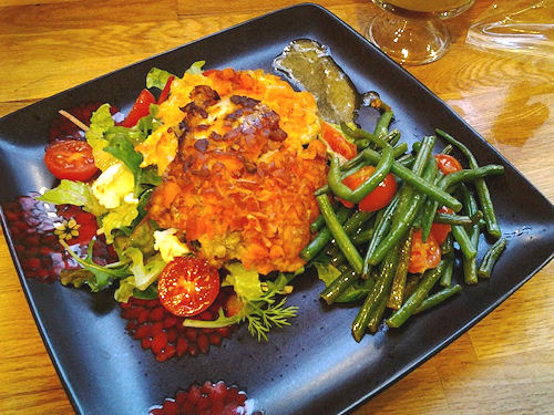 basil vinaigrette, crusted fish, dressing. aoli, fish, goat cheese, green bean saute, salad, sweet potato, talapia